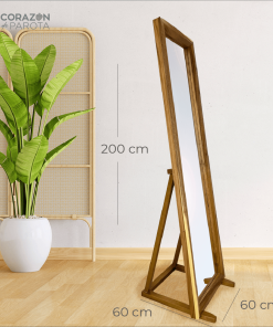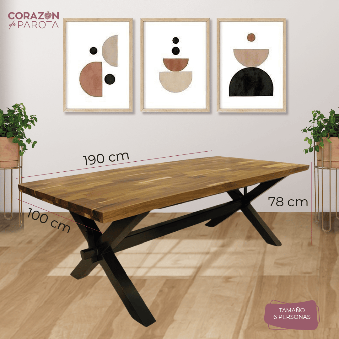 Mesa con cubierta fabricada en madera sólida de parota con un espesor de 3.5 cm, debidamente tratada y estufada, ensamblada, barnizada con poliuretano de altos sólidos, lo cual hace resaltar por su veteado único con diferentes texturas de la madera que van de los tonos rojizos a café obscuro, pasando por el blanco o tonos amarillizos en su contorno, el pedestal con madera sólida de pino barnizada con poliuretano color chocolate.